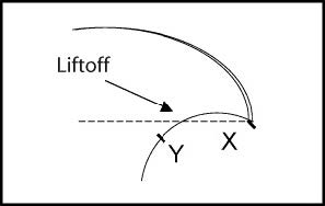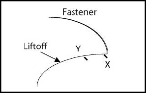 Liftoff AdjustmentWhen the probe is passed over the fastener head, an indication will be obtained similar to that of Figure 1. This is similar to fixed sliding probes. The liftoff is normally adjusted to be horizontal, as this is the conventional direction. The signal is not a straight line but a curve, so it is important to remember that we only need a reasonable compensation for the expected liftoff variations caused by paint and fastener head unevenness. A horizontal movement of the dot for the first 0.01 in. (0.25 mm) to 0.02 in. (0.5 mm) of liftoff is satisfactory. In Figure 1, it is the movement from the null point X to point Y, which will only cause a mainly horizontal shift of the display along that distance. Even this small distance can be a steep curve and may have to move slightly upwards before moving downwards (see Figure 2). The amount of vertical movement for the required liftoff is distributed so that the display only shifts slightly above or below the horizontal. | ![]() Fig. 1 ![]() Fig. 2 |