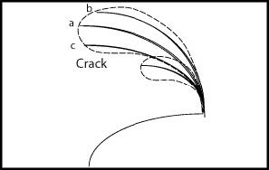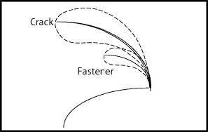 Crack DetectionWhen the probe moves over a fastener hole with a crack, the indication changes and typically will create a larger loop and vertical movement (see Figure 4). The main difference between scanning in the crack direction or at right angle to the crack is the shape of the indication. The dotted line shows the indication obtained when the probe travels over the length of the crack (0° scan). The solid line shows the indication from traveling at right angles to the crack (the normal 90° scan). When the crack is scanned slowly along its length, the phase changes, displaying a loop. But when moving at right angles to the crack, it is seen by the probe abruptly, and gives a sharp narrow signal. This signal will meet the loop at some point in its travel depending on the probe alignment. Both these signals can be observed by scanning the same fastener hole in the two directions (see Appendix: Scan Directions to Help Ensure All Cracks Are Evaluated). If two cracks on opposite sides of the fastener hole are present with the probe moving at right angles and centralized over the fastener, the indications will typically add up to a larger indication. This is because both are being detected at the same time (with a fixed probe they would normally be detected one after the other in a 0° scan). | ![]() Fig. 4 |
