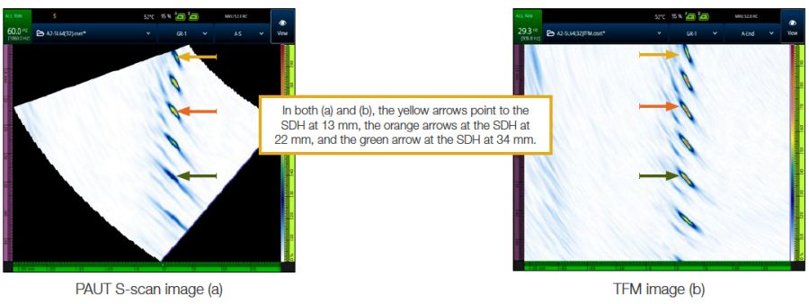 In the PAUT S-scan (a), each A-scan is acquired using a unique focalization depth of 22 mm. SDHs located in the focal area appear with similar amplitude and size. SDHs located far from the focalization depth appear distorted and with a lower amplitude. Several images with various focalization depths are needed for a more uniform sizing of all the SDHs in this test part.