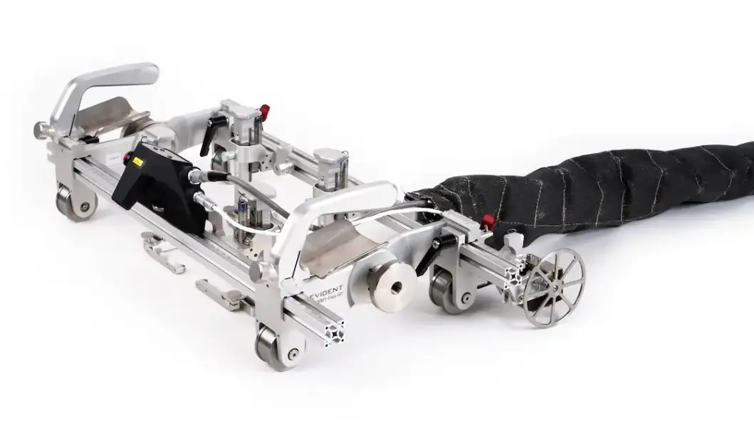 The HSMT-Flex scanner is a field-proven tool used by pipeline inspectors for two decades. Engineered for steady, encoded one-axis ultrasonic testing on circumferential welds, it supports phased array (PA), time-of-flight diffraction (TOFD), and conventional UT probes. It can be configured to hold up to eight probes to increase coverage when inspecting thicker materials and can fit on pipes as small as 114 mm (4.5 in.) in diameter.