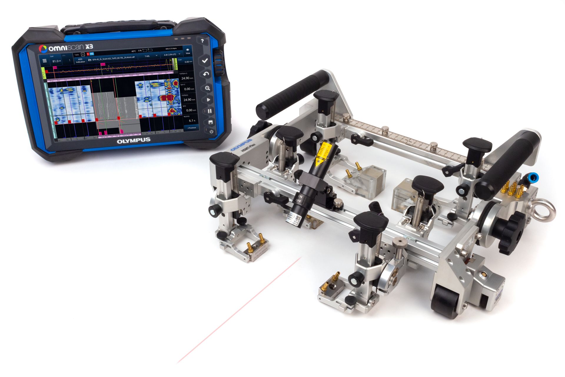 OmniScan X3 flaw detector with the AxSEAM long seam scanner (left) and HSMT-Flex girth weld scanner (right)