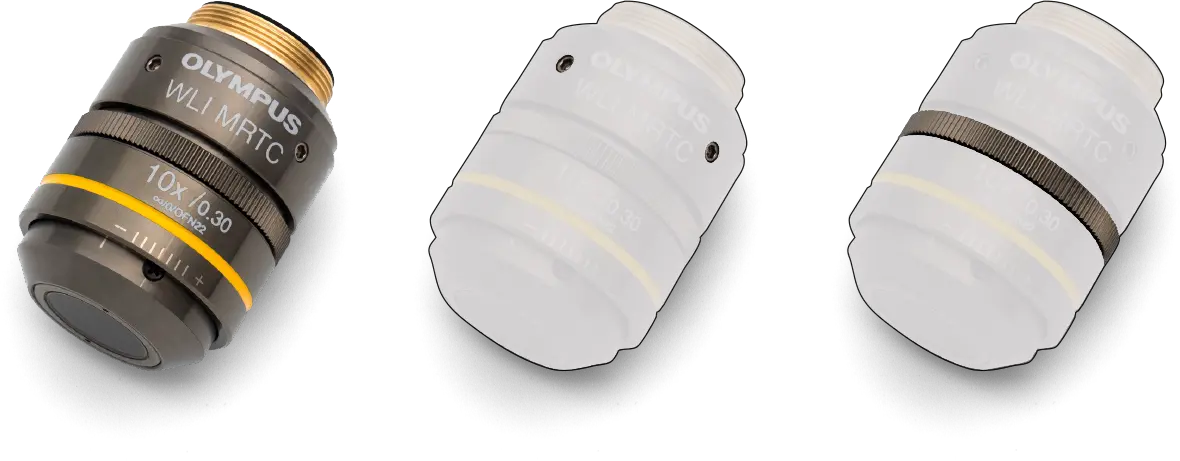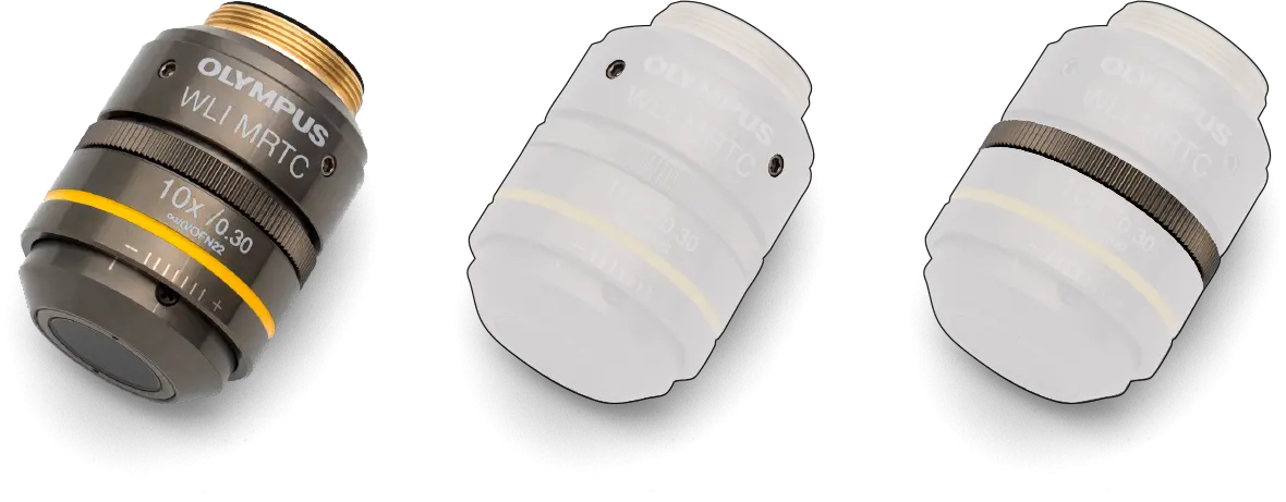 Evident’s WLI objective lenses (left) include fixing screws (middle) and an adjustment ring mechanism (right).