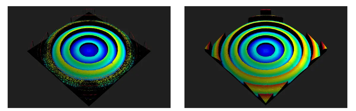 Comparison images of a Fresnel lens sample taken with a conventional WLI 20X objective (NA 0.4) and Evident’s 20X WLI objective (NA 0.6).