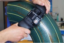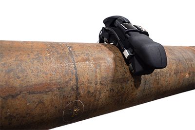 The scanner is used with an OmniScan™ X3 or SX instrument to detect and measure different types of damages or anomalies such as remaining wall thickness, corrosion pitting, and mid-wall lamination or inclusions. High-density data combined with the multiple views available on the flaw detector or OmniPC™ software provide clear images of the elbow’s condition and make data interpretation faster and easier. The scan direction is encoded, and there’s an indexing button positioned directly on the scanner to perform index increments in the second axis. Magnetic wheels keep the scanner firmly attached to the pipe, while a foam gasket is permanently in contact with the surface to keep the water column filled. | ![]() |