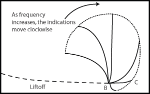 Este método es usado solamente para medir. La detección se efectúa primero con una frecuencia capaz de penetrar las dos capas bajo inspección. Para realizar esta operación, es mejor agregar sus espesores juntos y usar la profundidad estándar de penetración (vea el procedimiento de medición de corrosión en una capa descrito anteriormente en este documento). Si ninguna señal detectada es rechazada, la estructura es considerada correcta. Cuando se identifica un área sospechosa, el peor punto es marcado cuidadosamente en la superficie, para luego ser inspeccionado en función del punto correcto conocido, que es empleado como el punto cero. Este debe estar los más cerca posible del punto de interés para evitar otras variaciones (vea la Figura 10). En cada etapa de frecuencia, la sonda se compensará a cero en el punto correcto (y el despegue será definido a horizontal), después será ubicada en el punto que ha sido marcado como sospechoso. Como la frecuencia es incrementada, la corrosión sospechosa se desplazará en sentido horario (vea la Figura 11) hasta alcanzar la misma amplitud vertical del punto cero (se encontrará en la línea y a la derecha de la línea de despegue). |