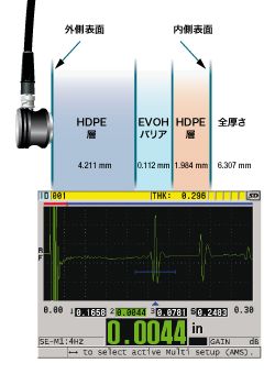 ハイペネトレーションソフトウェアオプション一振動子型探触子(0.5MHz~30MHz)を使用して、厚手の材料やゴム、グラスファイバー、鋳物、複合材などの超音波減衰材料を測定することができます。 多層材測定ソフトウェアオプション最大4つの各層の肉厚測定を同時に計測し表示します。また、選択した層の厚さ値の合計を表示できます。代表的な用途には、樹脂燃料タンク、PETボトルのプリフォーム、ソフトコンタクトレンズといった多層プラスチック製品のバリア層厚さ測定などがあります。 |
