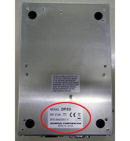 DP20のコントローラ底面(図1.参照)に貼付されているラベルにより、型式名とシリアルナンバーの末尾をご確認いただきます。