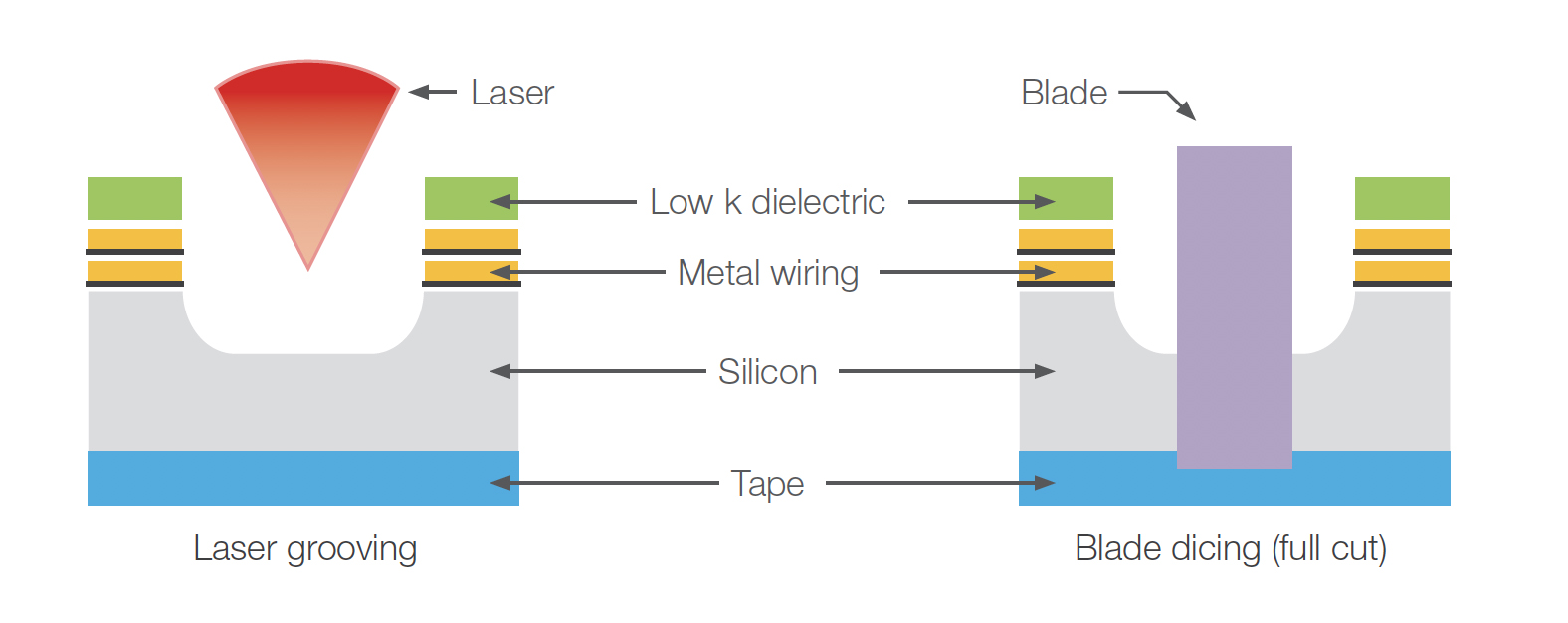 传统的切割工艺使用一种非常锋利的刀片切割硅晶圆,以得到单独的芯片。然而,刀片切割会出现问题。特别是,无论刀片有多锋利,都会向芯片和作为整体的晶圆施加应力。为了获得越来越小、越来越薄的芯片,以及转而使用低k值(介电常数)电介质和铜材料,需要在使用刀片切割晶圆之前采用激光技术在晶圆表面刻蚀开槽,以克服电介质材料的顶层部分和亚表面裂纹等问题。