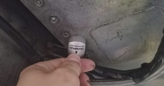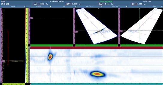 为了帮助检测人员更快地完成对紧固件孔的检测,奥林巴斯创建了一款小接触面旋转探头。这款探头的圆柱形外壳中装配有两排横波线性晶片。这种外壳以磁性方式将探头耦合在每个突出的紧固件头部的周围,从而简化了检测过程。  显示了3个相控阵组的检测结果:两组扇形扫查数据用于探测裂纹,第三个组用于核查耦合质量。易于解读的数据可被实时记录下来,以在C扫描中以图像形式显示探测到的裂纹,而耦合通道显示为一条红色的细线。 | 首先,检测人员要对紧固件施用一层薄薄的喷雾或耦合剂。然后,将探头以磁性方式吸附在紧固件头上,再将探头旋转180度,完成对紧固件孔的360度全方位检测。这种解决方案即节省时间,又无需拆解机械。  对头顶上的飞机紧固件孔进行检测  使用新款探头检测一个紧固件获得的结果 |
