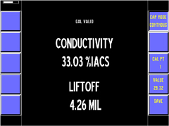 A second way to measure the thickness of a nonconductive coating on a conductive material is using the conductivity measurement capability of Olympus NORTEC™ 600 series instruments (N600C, N600S, and N600D models). This measurement uses a special conductivity probe that displays the below screen instead of the standard impedance screen shown above. This measurement is most commonly used to determine the conductivity of a material, but it also provides the thickness of a coating, which is considered the “Liftoffˮ from the material, or how far the probe is above the surface of the conductive material. This example was a 0.004 in. coating on an aluminum test piece.