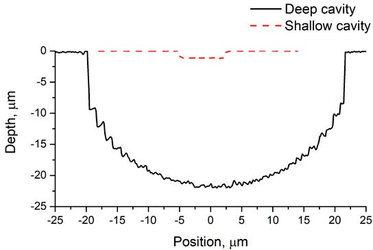 Figure 4. Cavity profile measurements. (a) A 1.07 μm-deep cavity, and (b) a 21.94 μm-deep cavity. (c) The profiles of the two cavities. The OLS5000 microscope proves to be an excellent tool to map shallow and deep cavities.