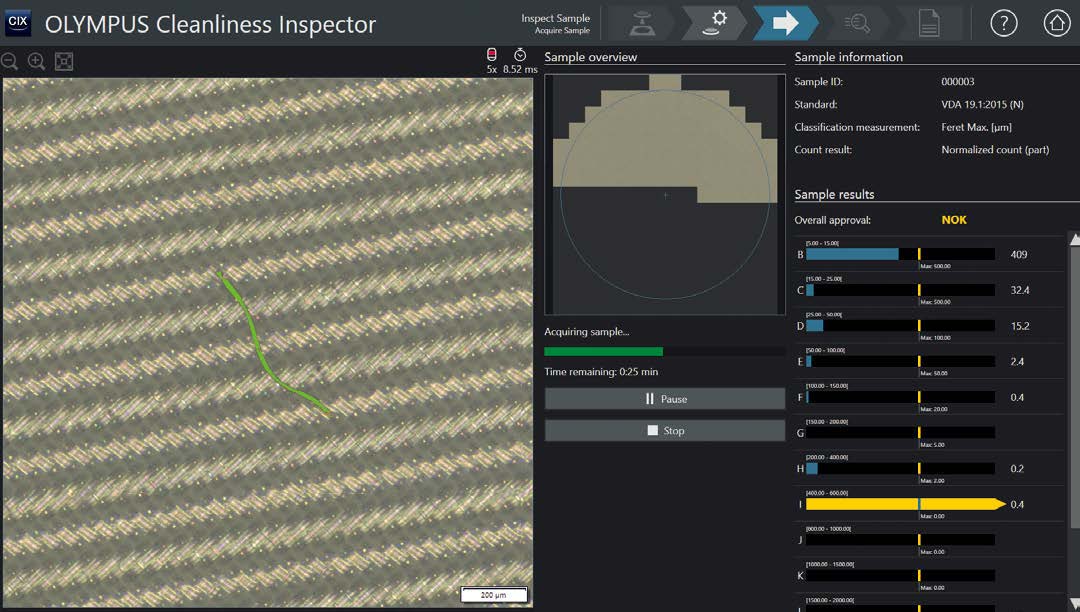 为每个大小等级预先定义的可接受颗粒计数显示在屏幕上,因此甚至在完成整个滤膜的扫描之前,就可以做出合格(OK)或不合格(NOK)的验证评判。
