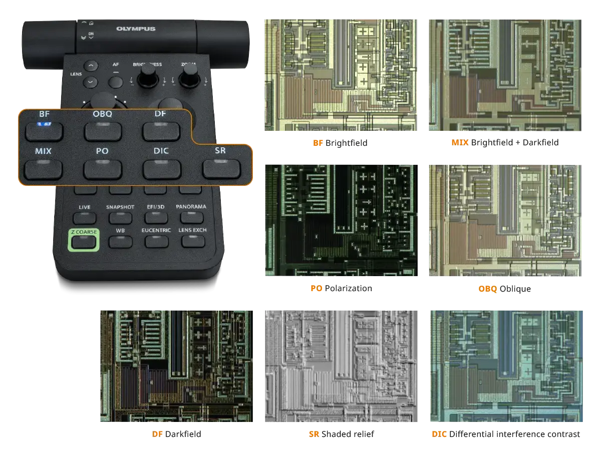 一键查看重要信息只需点击一下按钮,DSX2000显微镜就能提供七种不同的观察方法。尝试使用明场(BF)、偏斜(OBQ)、暗场(DF)、MIX(暗场+明场)、偏光(PO)、微分干涉*(DIC)或我们独特的阴影浮雕法(SR),可以找到优化的观察条件。 *SZH型号上不提供这种观察方法 | ![]() |