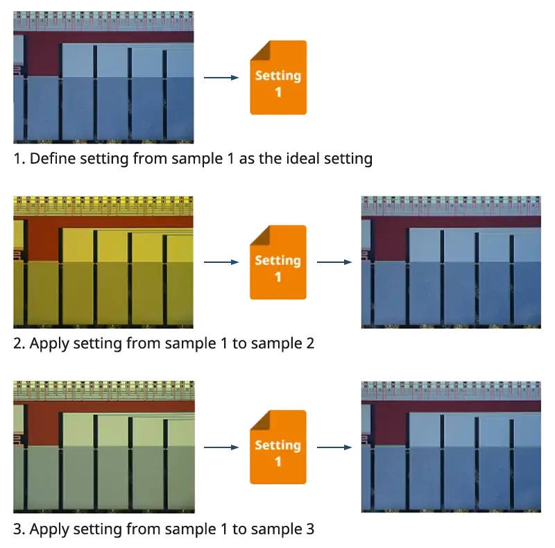 保存和调用观察设置捕获的图像会自动记录观察设置。只需点击一下,即可重复使用条件,以实现成像的一致性和可重复性。 | ![]() |